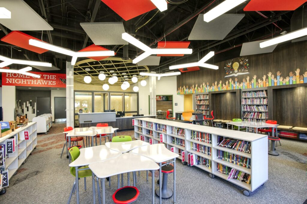 A library renovation at Mesa Community College included a custom millwork circulation desk, staff workstations, display shelving, and collaborative study area cabinetry covering approximately 3,500 SF. Castaldi coordinated shop drawings to meet ADA accessibility requirements at all service counters and public-facing surfaces throughout the project.