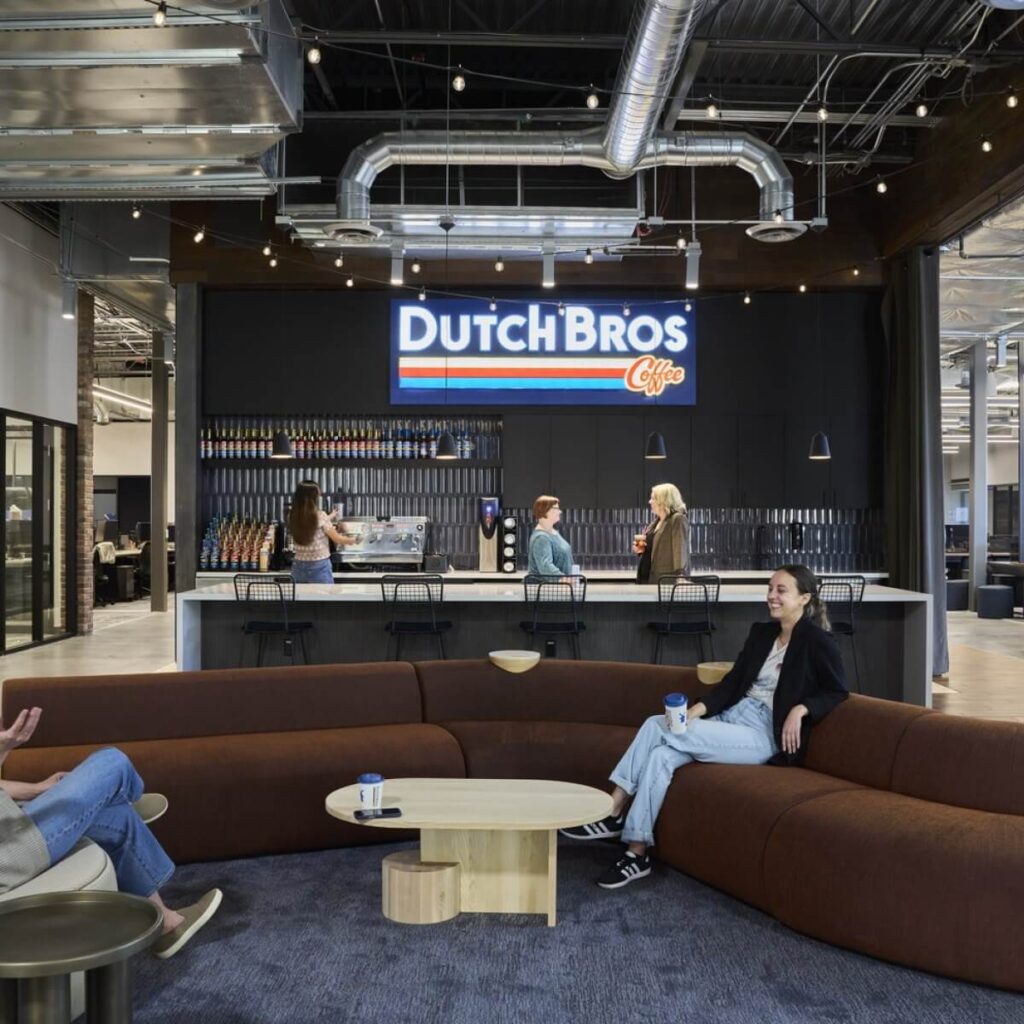 Castaldi delivered a complete millwork package for the Dutch Bros Coffee corporate headquarters tenant improvement in Scottsdale. Scope included a custom reception desk, 200+ linear feet of open-office storage and shelving, a custom executive conference room wall panel system, and break room cabinetry. The design-forward aesthetic required precision color matching and seamless panel reveals throughout.